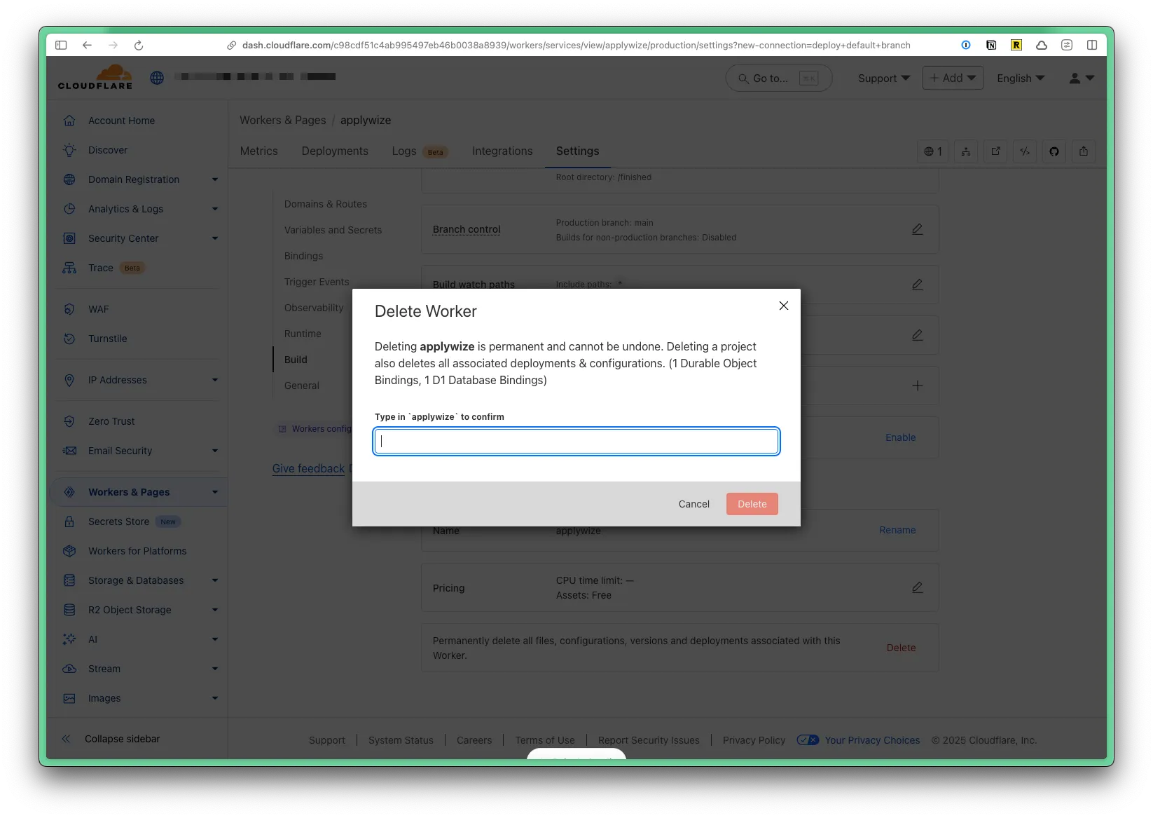 Section titled “Deleting Your Project”If for whatever reason, you need to delete your project through Cloudflare, go to Workers & Pages in the left side navigation. Then, click on the name of your project. Click on the Settings tab, then scroll to the bottom of the page. Click on the Delete button.